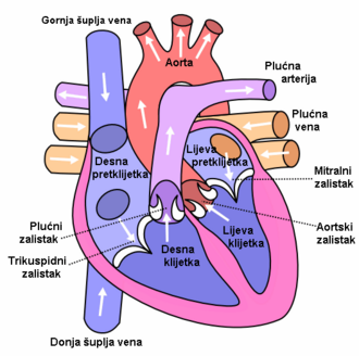 U plućima se krv rješava ugljik-dioksida, a obogaćuje kisikom. Takva pročišćena krv sada je arterijska te iz pluća dolazi u lijevu pretklijetku plućnim venama (iako sadrže arterijsku krv, zovu se vene jer dolaze s periferije u srce). Iz lijeve pretklijetke arterijska krv dalje odlazi u lijevu klijetku pa u aortu, koja je raznosi po cijelome tijelu. Budući da lijevo srce pumpa arterijsku krv u cijelo tijelo (a desno srce vensku krv samo u pluća), u lijevom su srcu tlakovi triput veći te su njegove stijenke deblje i jače.