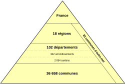 - 36 571 općina (communes). Ovaj nivo upravne podjele, skoro u svim slučajevima, odgovara području jednog grada ili sela. Općina može pokrivati više kantona, ali se može nalaziti samo u jednom departmanskom okrugu. Općinom upravlja izabrano kpćinsko vijeće, na čelu koga je načelnik ili gradonačelnik (maire). Ono raspolaže općinskim proračunom, koji se može upotrijebiti za razne svrhe.