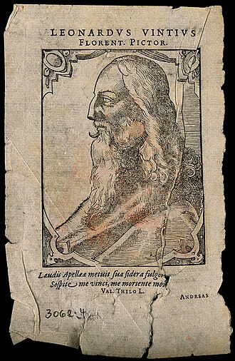 Otisak koji pokazuje poderotine,izbljedjelu boju te oštećenja prouzrokovana vodom. Leonardo da Vinci,drvorez,autor T. Stimmer, 1589