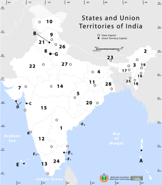 Indija je podijeljena na 28 država (koje su dalje podijeljene na distrikte), šest saveznih teritorija i Teritorij nacionalnog glavnog grada Delhi. Države imaju vlastite izabrane vlade, dok saveznim teritorijima upravljaju administratori koje postavlja savezna vlada.