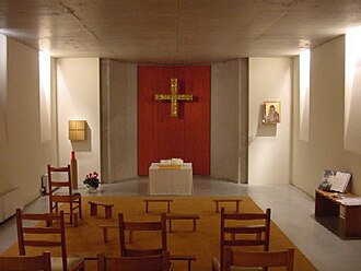 Središnji liturgijski prostor danas se nalazi na katu i do njega se dolazi po stepenicama ili dizalom. Za razliku od redovitih katoličkih crkva u tom prostoru nema svetohraništa kako bi bio što prikladniji za što veći broj kršćanskih zajednica – osobito reformiranih konfesija. Budući da taj dio kapelice više nema svoju izvornu visinu ugrađeni su novi prozori, djelo bečkoga umjetnika Thomasa Reinholda. Prozori na zidovima prikazuju: Stvaranje, Utjelovljenje, Gorući grm i Silazak Duha Svetoga, a prednji prozor na pročelju ocrtava Uskrsnuće. Na malom koru s lijeve strane kapelica ima orgulje iz radionice Etiennea Debaisieuexa; instrument je poklonila Njemačka Evanđeoska Crkva (Evangelische Kirche Deutschlands). Na drugom katu poviše nalaze se uredi i dvorana (izvana se ne vide).
