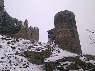 Iz tornja se mogu vidjeti okrugli bedemi, koje je postavio Vlček iz Čenova. Druga vrata se zatvaraju željenim klinom. Cijeli donji dio drugog dvorišta je zatvoren građevinama i ima nepravilan oblik. Treća vrata vode do unutrašnje palače. Dvorište pred zamkom bilo je puno gospodarskih drvenih zgrada. Građevine od cigle su najmlađe na zamku i potječu iz 15 stoljeća. Bazen na lijevoj strani služio je kao rezervoar kišnice ili se voda donosila od ispod zamka. Bio je dubok oko 10 m, ali je postupno zakopan.