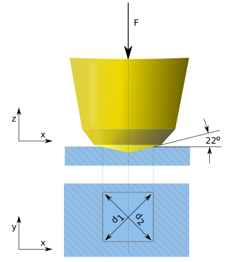 gdje je: A – površina udubljenja dijamantne četverostrane piramide (mm2), F – tlačna sila utiskivanja (N). Površina udubljenja dijamantne četverostrane piramide se može izračunati: