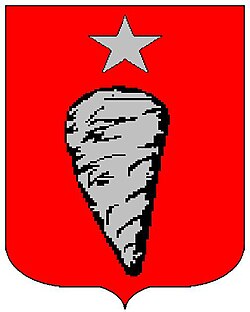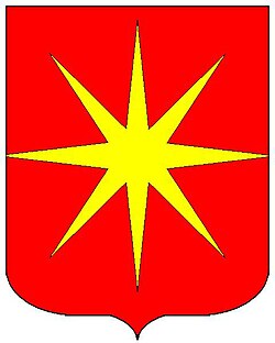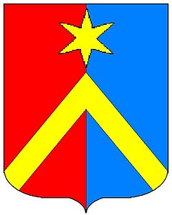 (HR) Okomita podjela. Lijevo crveno polje, desno plavo polje. Preko svega prelomljena zlatna greda, iznad grede šestero kraka zlatna zvijezda. [1/46, 2/27]