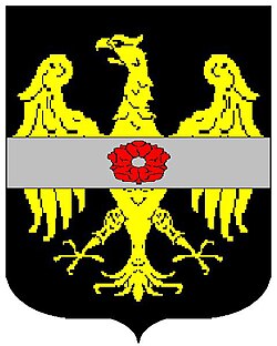 (HR) Na crnom polju zlatni orao. Preko svega vodoravna srebrena greda, duž grede crveni cvijet (ruža). [1/67]