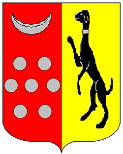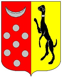 • (HR) Okomita podjela. Lijevo polje crveno, na crvenom polju sedam srebrenih krugova 1, 2, 1, 2, 1, iznad njih ležeći srebreni polumjesec, desno na zlatnom polju crni pas. [1/67]