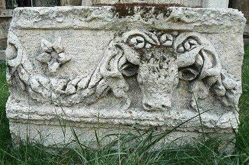 Kao dekorativni motiv javlja na metopama hramova dorskoga reda, te na frizovima, žrtvenicima i nadgrobnom spomenicima, osobito u rimskoj umjetnosti.
