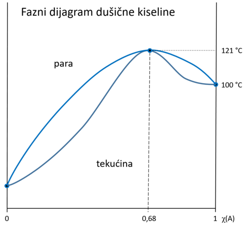 Neke smjese pokazuju negativna odstupanja od Raoultova zakona a time vrelište smjese raste. To povišenje točke vrelišta može biti toliko da smjesa vrije pri višoj temperaturi nego bilo koji sastojak. Smjesa takvog sastava je azeotrop maksimalnog vrelišta. Primjer je nitratna kiselina masenog udjela 68,2% koja vrije bez promjene sastava pri 121 °C. Frakcijskom destilacijom azeotropne smjese mogu se dobiti jedan čisti sastojak i azeotrop.[2]