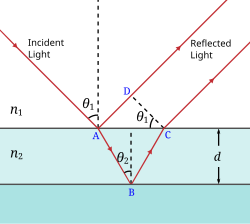 Mjehur sapunice mijenja kod napuhavanja sve moguće boje, a isto takvu pojavu pokazuje i vrlo tanki sloj ulja na površini vode. To objašnjavamo na ovaj način. Zraka svjetlosti koja dolazi u sloj debljine d reflektira se na donjoj površini, a druga zraka reflektira se na gornjoj površini. Ako obje zrake shvatimo kao linijske valove, onda između prve i druge zrake postoji razlika prijeđenog puta, odnosno pomak faze.
