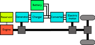 - Serijski hibrid - Pogonske kotače pogoni isključivo elektromotor kojemu nije potrebna transmisija i nije u mehaničkoj vezi sa motorom SUI. Izoliranost motora SUI omogućuje njegov rad u optimalnom području s najmanjom potrošnjom goriva i korištenje po potrebi. Serijski hibridi imaju veće pakete baterija koji se pune pomoću motora SUI koji pokreće generator ili energijom kočenja (regenerativno kočenje)[1]. Zbog toga su obično i skuplji. BMW i3 i Fisker Karma opremljeni range extenderom primjeri su serijskih hibrida, dok je Chevrolet Volt u toj skupini, ali za brzine iznad 110 km/h ima mehaničku poveznicu sa pogonskim kotačima. Wrightbus je proizveo autobuse Gemini 2 i New Routemaster koji su hibridi ove vrste. U avioindustriji, Siemens, Diamond Aircraft i EADS proizveli su zrakoplov DA36 E-Star koji je prvi puta poletio u lipnju 2013. koristeći ovaj pogonski sustav.