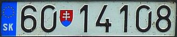 Slovačka registarska pločica. S lijeva na desno: 1. SK - međunarodna oznaka Slovačke na zastavi EU 2. KE - dvoslovna kratica (ovdje za Košice ) 3. Grb Slovačke 4. 246 - troznamenkasti broj (u rasponu od 001 do 999) 5. XY - dvoslovna oznaka (od AA pa dalje abecedno)