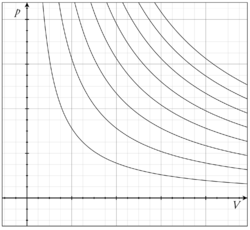 Odatle vidimo odmah i Boyleov zakon: "Kod konstantne temperature tlak se tako povećava kako se volumen umanjuje. Umnožak tlaka i volumena je konstantan."