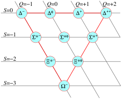 | Omega barion [11] | Ω− | sss | 1 672,45(29) | 0 | 3⁄2+ | −1 | −3 | 0 | 0 | (8,21 ± 0,011)∙10-11 | Λ0 + K- Ξ0 + π- Ξ- + π0 |