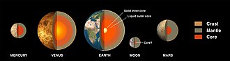 Merkur ima primijećeno magnetsko polje, za koje se vjeruje da se generira unutar njegove metalne jezgre.[34] Jezgra Merkura zauzima 85% radijusa planeta, što ga čini najvećom jezgrom u odnosu na veličinu planeta u Sunčevom sustavu; to ukazuje na to da je velik dio Merkurove površine možda izgubljen rano u povijesti Sunčevog sustava.[35] Merkur ima čvrstu silikatnu koru i plašt koji prekriva čvrsti sloj vanjske jezgre željeznog sulfida, nakon čega slijedi dublji sloj tekuće jezgre, a zatim moguća čvrsta unutrašnja jezgra koja čini treći sloj.