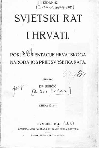 - Svjetski rat i Hrvati. Pokus orijentacije hrvatskoga naroda još prije svršetka rata, Zagreb, 1915. (pod pseud. Dr. Juričić), (2. izd., Zagreb, 1917. ; Institut društvenih znanosti "Ivo Pilar" - Družba Braća Hrvatskoga Zmaja, Zagreb, 2014.)