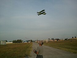 Model aviona u letu na sportskom aerodromu Čepin — udruga zrakoplovnih modelara.