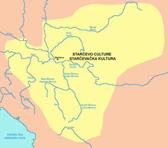 Starčevačka kultura je neolitička kultura što je tijekom VI. tisućljeća pr. Kr. obuhvaćala veliko područje od Transilvanije i Transdanubije, na sjeveru, do središnjih područja Albanije i Skopske kotline na jugu, Sofijske visoravni na istoku te do središnje Hrvatske i srednje Bosne na zapadu. Naziv je dobila po nalazištu Starčevo pokraj Pančeva, Srbija. Naselja su bila smještena na visokim riječnim terasama ili povišenim gredama, te na blagim padinama u riječnim dolinama. U ranijoj fazi gradile su se poluukopane kolibe nepravilna oblika sa šatorastom krovnom konstrukcijom, a u razvijenim fazama nadzemne pravokutne kolibe od pletera s podnicama od nabijene zemlje. Pokojnici su se pokapali unutar naselja, u zgrčenu položaju na boku. Gospodarska osnova bila je poljoprivreda, osobito uzgoj žitarica. Od životinja su se uzgajali govedo, manje ovce i koze te svinje. Oruđe i oružje izrađivalo se od različitih vrsta kamena cijepanjem i okresivanjem, glačanjem i brušenjem te od kosti i životinjskih rogova. Među keramičkim posuđem prevladavalo je grubo posuđe za svakidašnju uporabu ukrašeno tehnikom barbotina, otiskivanjem prsta i nokta, plastičnim naljepcima.[4]
