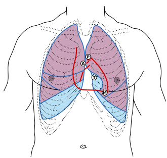 Projekcije auskultacijski polja (M - mitralno polje; T - trikuspidno polje; A - aortno polje; P - pulmonalno polje