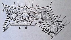 | Razvijeni bastionski front | A – odvojeni bastioni B – bastion C – kavalir D – tenalija E – kofr F – ravelin G – kontragarda F i G – anvelopa H – glavni rov J – glasija K – skriveni put i zborišta sa vatrenim položajima | |