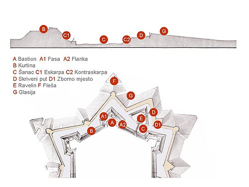| Novotalijanska | A – glasija B – skriveni put C – ravelin D – bastion E – orion F – kavalir G – zborište | |