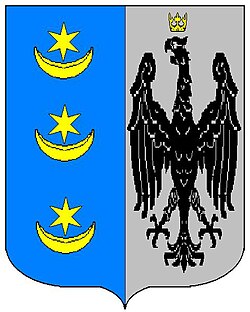 (HR) Okomita podjela. Lijevo na plavom polju tri ležeća zlatna polumjeseca sa šestero krakom zlatnom zvijezdom iznad svakog polumjeseca 1, 1, 1, desno na srebrenom polju crni orao okrunjen zlatnom krunom. [1/65] |