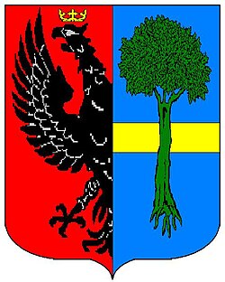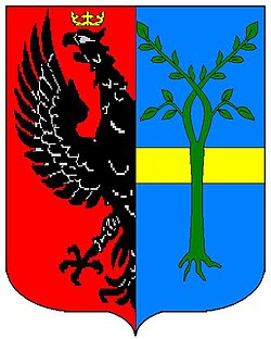 (HR) Plavo polje dijeli zlatna prelomljena greda. Iznad grede srebrena golubica u kljunu nosi zelenu grančicu (maslina), ispod grede srebreno krilo. [1/12, 5/5] |