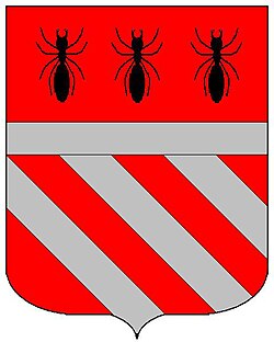 (HR) Vodoravna podjela. Gore na crvenom polju srebrena kula, dolje na srebrenom polju tri lijevo kose srebrene grede. [1/46] | |