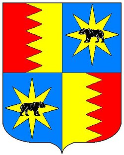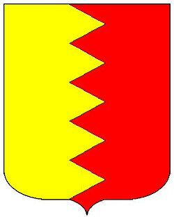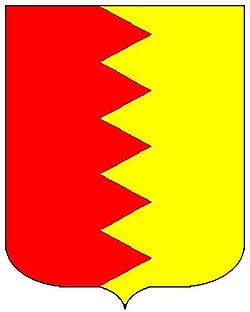 - (HR) Okomita podjela. Lijevo na crvenom polju tri lijevo kose zlatne grede, desno je vodoravna podjela; gore crveno polje, dolje zlatno polje, preko svega dva okomita ključa suprotnih boja od boja polja zlatno- crveni, ključevi su povezani uzicom. [1/24, 3]
