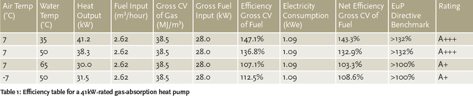 Apsorpcijske dizalice topline s prirodnim plinom kao izvorom topline su komercijalno dostupne. Za proizvodnju korisne toplinske energije pri maksimalnoj temperaturi od 70 °C i hlađenja kondenzata sa zrakom ili vodom, COP ( Coefficient of Performance ) iznosi 1,5. Drugim riječima za uloženih 1 kWh prirodnog plina dobije se 1,5 kWh topline. I u slučaju ugradnje u posebno hladnim klimatskim zonama kod -20oC, apsorpcijske dizalice topline još uvijek garantiraju djelotvornost energetske pretvorbe COP=1, te time postižu vrijednosti jednake ili veće od bilo kojeg kondenzacijskog kotla. [5]