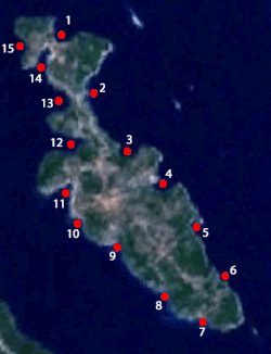Satelitska snimka otoka Rave sa istaknutim uvalama.