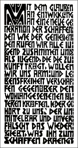 Kirchner 1906. godine piše manifest. Grupa je jako prisno surađivala, slikali su zajedno i vjerojatno ne bi uspjeli kao pojedinci. Bili su pod utjecajem njemačke srednjovjekovne umjetnosti, Matthias Grünewalda, primitivne umjetnosti, plemenske afričke i umjetnosti oceanije, Van Gogha i Gaugena. Prihvaćaju i njeguju grafičku tehniku drvoreza kojeg su usvojili vjerojatno pod utjecajem Müncha.