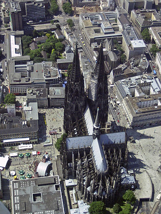 Izgradnja Kölnske katedrale je započela 1248. god. i trajala je, s brojnim prekidima, do 1880. god., što čini razdoblje od 600 godina. Duga je 144,5, široka 86,5 metara, a njena dva tornja su visoka 157 metara[2] Katedrala je jedna od najvećih svjetskih crkava i najveća gotička crkva u sjevernoj Europi. Godinama je, točnije od 1880. do izgradnje Washingtonskog obeliska 1884. god., bila najvišom ljudskom građevinom. Još uvijek ima drugi po visini crkveni toranj, od kojega je viši samo katedrale u Ulmu, koji je dovršen 10 godina poslije (1890.). Zahvaljujući dvojnim tornjevima, ima najveću fasadu od svih svjetskih crkava. Kor između stupova ima najveći omjer visine u odnosu na širinu, od svih srednjovjekovnih crkava (3.6:1), nadmašivši time i katedralu u Beauvaisu koja ima malo viši glavni brod.[3]