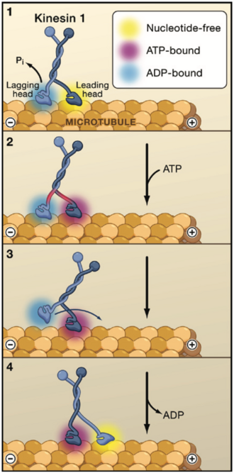 U početku su obje motoričke domene snažno vezane za mikrotubule te je inhibirano vezanje ATP-a na vodeću motoričku domenu. Otpuštanje anorganskog fosfata (Pi) iz zaostale motoričke domene potiče njezino odvajanje od mikrotubula nakon čega vodeća domena veže ATP. Time je potaknuto povlačenje zaostale motoričke domene na sljedeće vezno mjesto duž mikrotobula čime ona postaje novom vodećom domenom. Nakon zamijene položaja dviju domena, nova vodeća domena čvrsto je vezana i otpušta ADP. Zaostala domena podvrgava se hidrolizi ATP-a i otpušta Pi za nastavak ciklusa.[1][4]