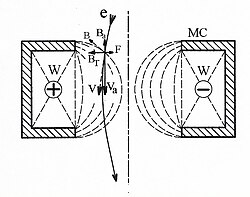 Važno svojstvo sile magnetskog polja na elektron jest da djeluje uvijek okomito na smjer gibanja elektrona. Ona nastoji elektron zakrenuti. Sila stoji okomito na vektor brzine. Osim toga, sila stoji okomito i na smjer magnetskog polja. Magnetsko polje ima smjer od pozitivnog pola do negativnog, dakle, odozdo prema gore. Elektron se kreće slijeva nadesno. Sila na elektron ima tada smjer prema natrag. Sila koja djeluje uvijek okomito na smjer brzine svija stazu čestice u kružnicu. Vidjeli smo da se planet vrti u kružnicu u kojoj sila ima smjer polumjera. Isto tako zadobiva elektron u magnetskom polju ubrzanje okomito na svoju brzinu. To ubrzanje jednako je v2/r. Newtonov zakon za gibanje elektrona u konstantnom, homogenom magnetskom polju glasi: