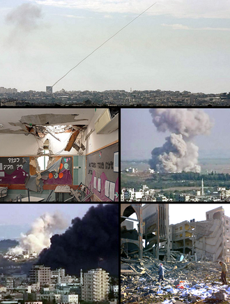 Kompilacija događaja tijekom rata (od gore prema dolje): 1. Raketa Grad ispaljena iz Gaze prema Izraelu. 2. Uništen dječji vrtić u Beer Ševi. 3. Dim nakon zračnog napada na Gazu. 4. Dim iznad zgrada u Gazi (fotografija Al-Jazeere snimljena je tijekom 14. dana rata) 5. Sklonište za izbjeglice, škola za siročad i džamija u Rafahu su uništene u zračnom napadu IDF-a koji ih smatra skladištem Hamasovih raketa | |||||||||