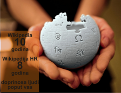 U subotu 22. siječnja 2011., između 14 i 18 sati (točnije vrijeme biti će objavljeno naknadno), u Zagrebu na lokaciji koja će biti prilagođena broju onih koji najave dolazak održat će se obilježavanje desete godišnjice Wikipedije u organizaciji udruge Wikimedija Hrvatske. Potvrdu dolaska molim ovdje.