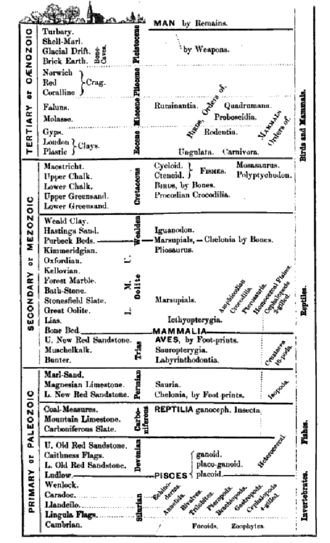 Znanje o fosilnim ostatcima nastavilo se ubrzano širiti tijekom prvih nekoliko desetljeća 19. stoljeća. Do 1840-ih glavne crte geološke vremenske skale postale su jasne, a 1841. John Phillips je imenovao tri glavne ere na temelju prevladavajuće fauna u svakom od njih: paleozoikom su dominirali morski beskralježnjaci i ribe, mezozoik je bio doba gmazova, a sadašnji kenozoik doba sisavaca. Progresivni crtež povijesti života prihvatili su čak i konzervativni engleski geolozi poput Adama Sedgwicka i Williama Bucklanda; no, poput Cuviera, napredak su pripisali ponovljenim katastrofičnim epizodama izmuiranja nakon kojih su uslijedile nove epizode stvaranja.[29] Buckland i još neki zagovornici prirodne teologije među britanskim geolozima pokušali su za razliku od Cuviera eksplicitno povezati posljednju katastrofičnu epizodu koju je predložio Cuvier s biblijskim potopom.[30][31]