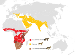 Linnaeus, 1758 Najveći od svih čagljeva i jedina vrsta čaglja koja obitava i izvan Afrike. Genetska istraživanja su dokazala da je rodbinski bliži sivom vuku i kojotu[2][3] Sjeverna Afrika, Jugoistočna Europa Srednji Istok, zapadna i južna Azija