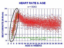 Čovječje srce počinje kucati frekvencijom sličnom majčinoj, oko 75–80 otkucaja u minuti (BPM, engl. beats per minute). Embrionalni srčani ritam (EHR, engl. embryonic heart rate) zatim ubrzava približno do 100 BPM tijekom prvog mjeseca da bi dosegao vrhunac na 165–185 BPM tijekom ranog sedmog tjedna nakon začeća (rani deveti tjedan nakon LMP-a). Ovo ubrzanje odgovara približno 3,3 BPM na dan ili oko 10 BPM svaka tri dana što je povećanje od 100 BPM u prvom mjesecu.[8][9][10] Formula regresije koja opisuje ovo ubrzanje prije nego što embrij dosegne 25 mm duljine tjeme-zadak ili 9,2 LMP tjedana jest: dob u danima = EHR(0,3)+6.[11]