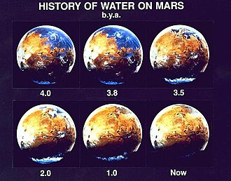 NASA je u ožujku 2004. obznanila da je rover Opportunity otkrio dokaze da je Mars u davnoj prošlosti bio vlažan planet.[51] To je podiglo nadu da bi se tragovi izumrlog života na Marsu mogli naći i danas. ESA je potvrdila da je orbiter Mars Express u siječnju 2004. izravno otkrio ogromne zalihe zaleđene vode na Marsovom južnom polu.[52]