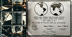 - ↑ Here Men From The Planet Earth First Set Foot Upon the Moon, srpanj 1969. A.D. We Came in Peace For All Mankind.
