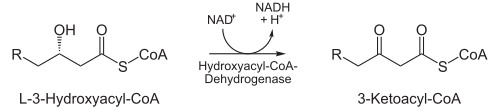 | Oksidacija NAD+-om: Treći je korak oksidacija L-β-hidroksiacil-CoA od strane NAD+, pri čemu se hidroksilna skupina konvertira u ketonsku skupinu. | L-β-hidroksiacil CoA dehidrogenaza | β-ketoacil-CoA | |