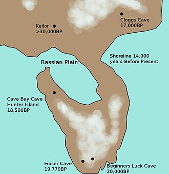 Tasmanski Aboridžini stigli su na Tasmaniju prije otprilike 40,000 godina preko kopnenog mosta zvanog Bassov ravnjak za vrijeme zadnjeg Velikog ledenog doba.[1] Prije otprilike 8,000 godina podigla se morska razina te je tako nastao Bassov prolaz koji je odvojio Tasmanske Aboridžine od ostatka Australije. Također su živjeli na otocima Flinders na samom prolazu do prije otprilike 4,000 godina.