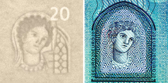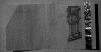 - Bar kod - Kad se novčanice drže prema svjetlu, s desne strane vodenog žiga vide se tamne trake. Broj i širina ovih traka označavaju apoen novčanice. Kada se skeniraju, ove se trake pretvaraju u Manchester kod. [82]