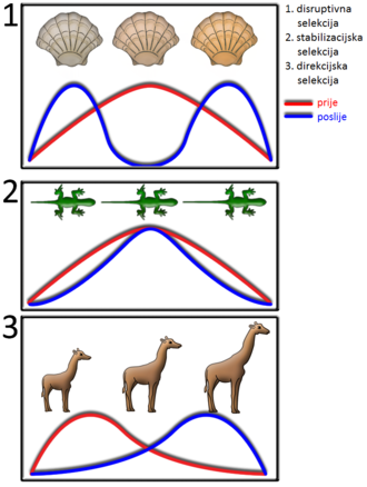 Prirodna selekcija unutar neke populacije za neku crtu koja može varirati duž nekog raspona vrijednosti, kao što je visina, može se kategorizirati u tri različita tipa. Prvi tip čini direkcijska selekcija koja označuje promjenu u prosječnoj vrijednosti neke crte tijekom vremena — na primjer, organizmi polagano postaju viši.[82] Drugi tip čini disruptivna selekcija ili selekcija za ekstremne vrijednosti crte koja često rezultira u dvjema različitim vrijednostima koje postaju najuobičajenije, sa selekcijom protiv prosječne vrijednosti. To bi se zbilo onda kada ili niski ili visoki organizmi imaju neku prednost, no nemaju je oni srednje visine. Konačno, u stabilizacijskoj selekciji postoji selekcija protiv ekstremnih vrijednosti crte s obaju krajeva, koja uzrokuje smanjenje varijance oko prosječne vrijednosti i manju raznolikost.[75][83] To bi, na primjer, uzrokovalo da organizmi polagano postanu svi jednake visine.
