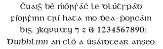 Prva irska rečenica u svakoj slici, Chuaigh bé mhórshách le dlúthspád fíorfhinn trí hata mo dhea-phorcáin bhig, je pangram koji znači "Uvelike zadovoljna žena prošla je zaista bijelim ašovom kroz šešir moje dobrećudne malene ugojene svinje." Druga rečenica glasi Duibhlinn/Ceanannas an cló a úsáidtear anseo, "Duibhlinn/Ceannanas je vrsta slova korištena ovdje". Druga rečenica koristi kraće oblike slova r i s; prva rečenica koristi duže oblike.
