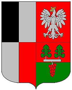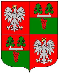 - (HR) II. Podjela na četvrtine. 1 i 4 četvrtina na crvenom polju bijeli orao (Poljski grb), 2 i 3 četvrtina vodoravna podjela, gore na crvenom polju dva uspravna zelena lista vinove loze povezana srebrenom granom, dolje na zelenom polju crveni grozd povezan s granom s gornjeg polja. [1/49, 2/79]