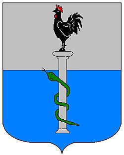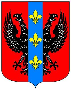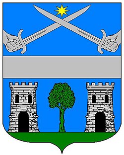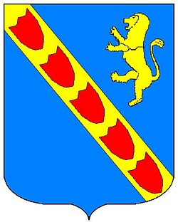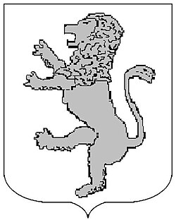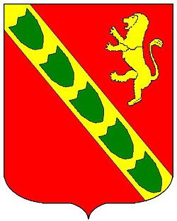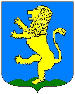 (HR) Na plavom polju zlatni lav koji stoji na zelenom trobrjegu. Preko svega lijevo kosa greda, duž grede dva reda srebreno crvenih paraleograma. [1/24] | |