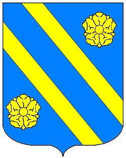 (HR) Vodoravna podjela. Gore na srebrenom polju crveni pas u trku, dolje tri para lijevo kosih greda crno srebrene. [1/25, 2/5] |