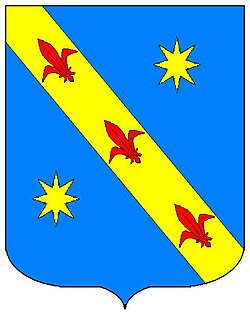 (HR) Na plavom polju lijevo kosa zlatna greda, duž grede tri crvena ljiljana. Iznad i ispod grede po jedna šestero kraka srebrena zvijezda. [1/6, 6/5] | |
